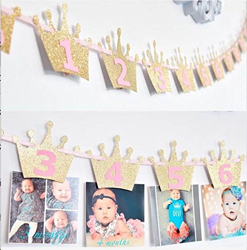 1st Birthday Decoration Monthly Milestone Photo Banner from Newborn to 12 Months. (Crown Pink)