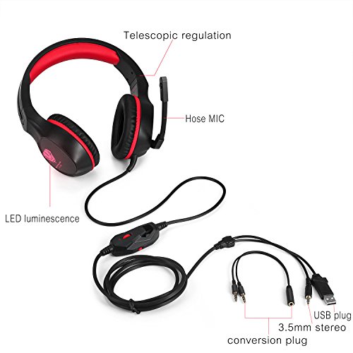 - Glaring LED lights are designed on the ear cups, Good air permeability protein over-ear pads and light weight design that is more comfortable for long time wear. Self-adjusting beam design( 120 degree up and down) give you the best gaming experience.