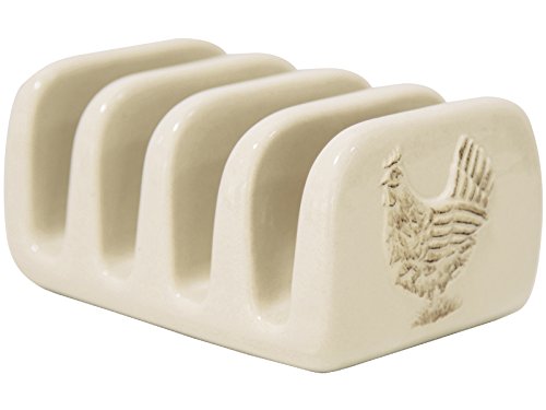 Bring the taste of the countryside into your home with this stoneware toast rack in cream. It comes from the Farmers Market collection by Creative Tops. The rack features an embossed hen in brown at each end. It holds up to 4 slices of toast and measures 14.3cm/5.6in long by 7.5cm/3in high and 10.0cm/4in deep. It is dishwasher safe.
