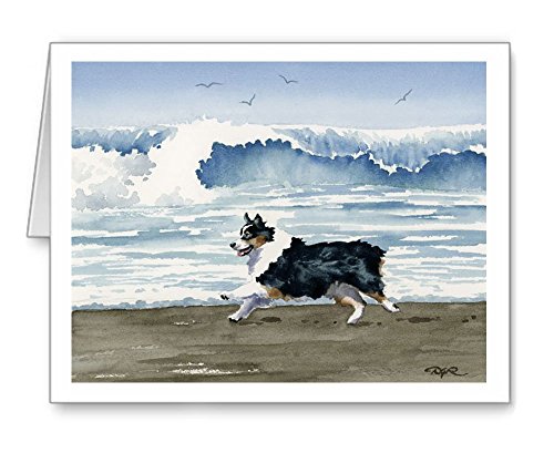 -. Feature : "Australian Shepherd Beach" artwork by watercolor artist DJ Rogers. / Note card size is 4.25 x 5.5 inches / Matching white envelopes included. / Note cards are blank inside for your personal message. / Suitable for framing.