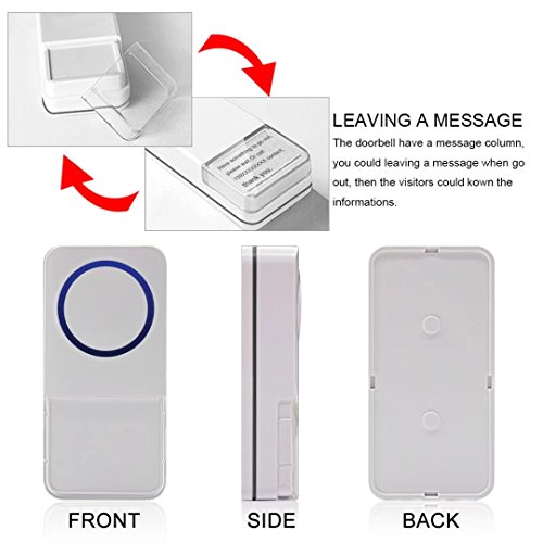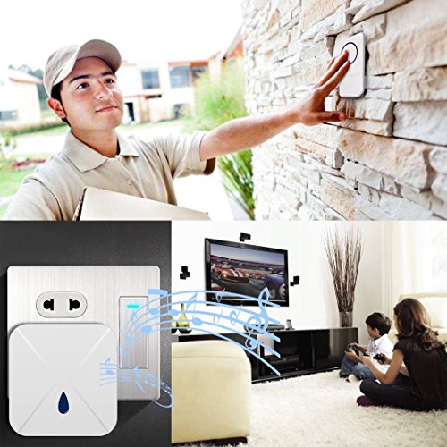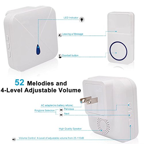 THE BEST FEATURES - Super long range 1000ft . Massive 52 different melodies . 5 volume levels . Super loud 120db . LED rings light up on button press . Receiver requires no batteries and can be plugged into any household outlet 110V. Transmitter (push button) includes transparent cover so you can add a personal note or apartment number.