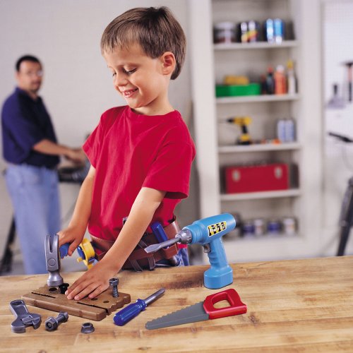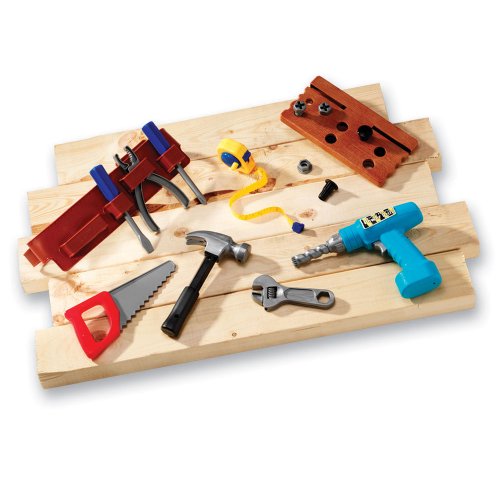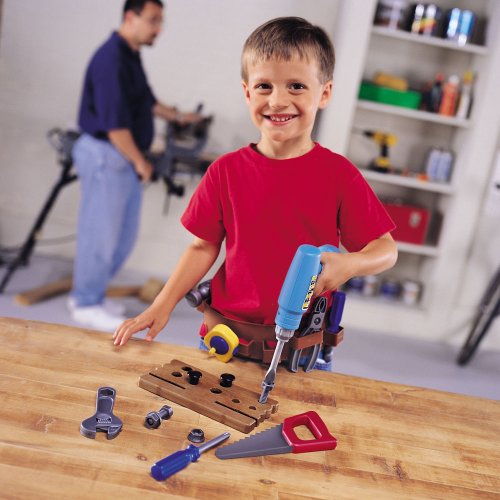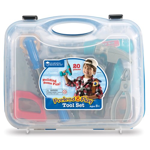 - Feature : Contains everything young builders need for construction play / 20-piece set / Made of durable plastic / Sturdy 2" x 14" x 3.5"carrying case / The set includes durable plastic hammer, saw, tape measure, nuts, bolts, wooden board for drilling, battery-powered drill and handy tool belt