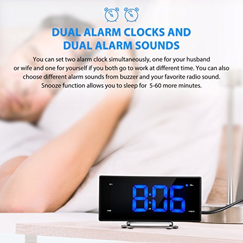 DUAL ALARMS & DUAL ALARM SOUNDS: The dual alarms make it possible to set two separate wake-up times when you and your partner go to work at different times. You can choose standard buzz or the preset station you like as the alarm sound. The buzzer alarm gets incrementally louder, so it will not scare you awake. Snooze function allows 5-60 extra minutes of sleep before alerting you again.