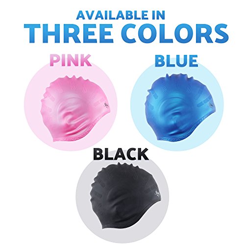 UNIVERSAL SIZE AND AVAILABLE IN 3 COLORS. The waterproof swim cap stretches very well – great for both men and women. We offer our silicone swim caps in 3 colors: black, blue and pink.