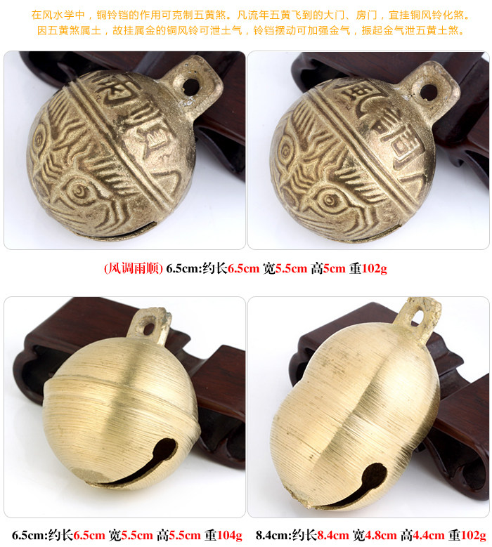 In Feng Shui, the role of copper bells can be restrained five yellow evil. Where fleeting five yellow flew the gates, doors, should be linked to copper wind chimes defends. Because of five yellow evil territory, so to hang a gold copper wind chimes can vent rustic, gold bells swing can enhance the gas, the gas vent five loess shake-gold evil.