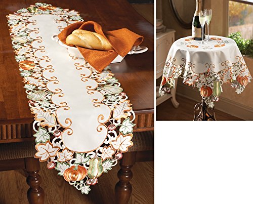 Make any meal this season into a special event when you serve it on a dining table dressed in fall's prettiest toppers. Finely crafted table topper's feature pumpkins and autumn leaves in autumn-hued embroidery, scalloped edges and cutout work around the edges. Makes an impressive way to dress up a buffet or dresser. Polyester; imported. Machine wash. Runner 60" x 14"; Square 33 1/2"Sq. Choose from: Runner or Square.