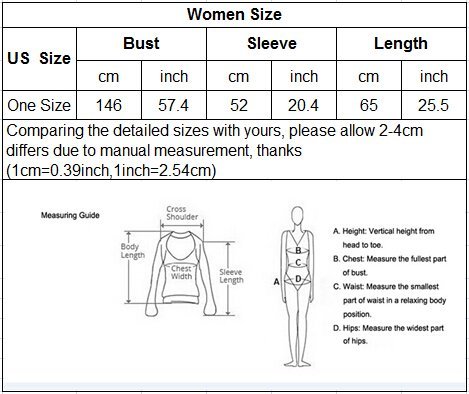Bust:146cm57.5inch, Sleeve:52cm20.5inch, Length:65cm25.6inch.This apparel may fit for the weight that below 75 KG.