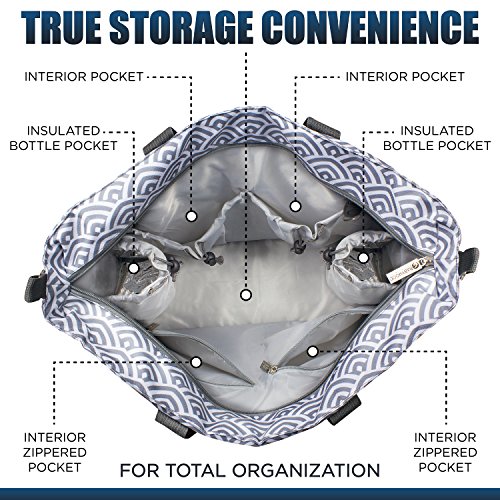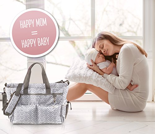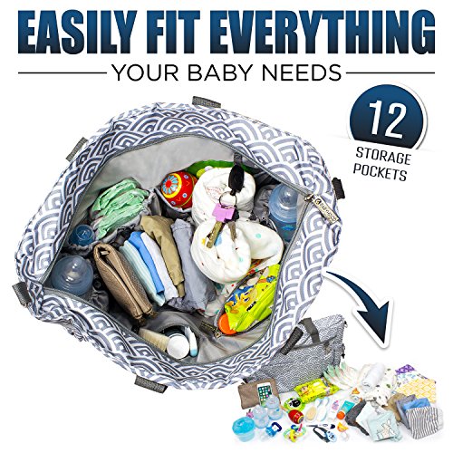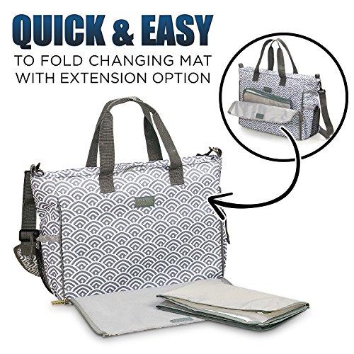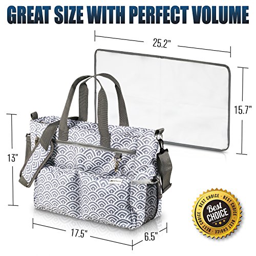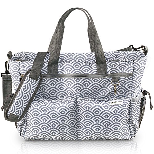 TOP QUALITY MATERIALS: Using premium durable oxford Polyester 600D of a gray and white scallop design that is waterproof and water-resistant, the BABYHOOD UNISEX DESIGNER BABY TOTE is long and wide compared to others that are tall and deep so it offers easy access to all its contents quickly; having a reinforced bottom to hold a large capacity and heavy-duty zippers, all stitching is implacable and strong with no loose threads; it can be washed by wiping it down with a damp cloth