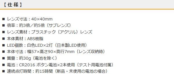 fk094igrjs光学レンズにより約3倍、約5倍(サブレンズ)に拡大されます サイズ 個装サイズ:8×18×1cm 重量 個装重量:70g 製造国 中国 LEDライト搭載スライドオープンすると自動で点灯します 光学レンズにより約3倍、約5倍(サブレンズ)に拡大されます ご注文後3~4営業日後の出荷となります