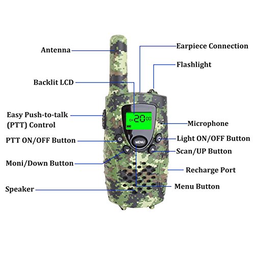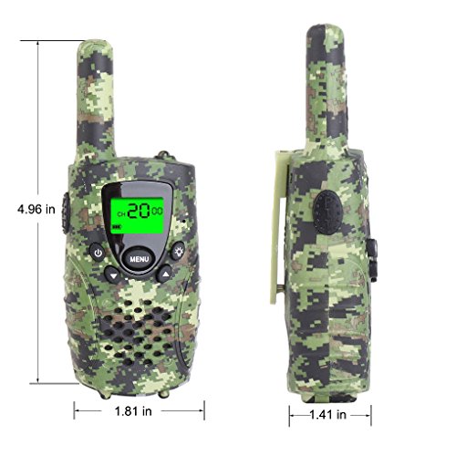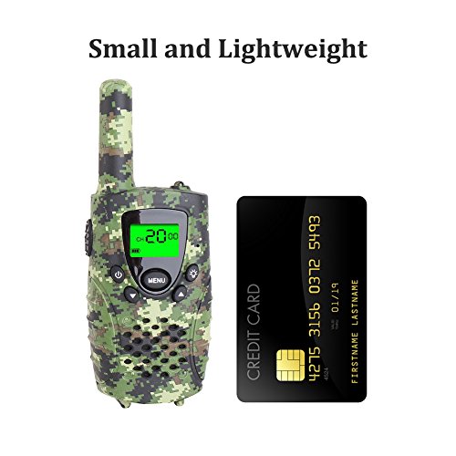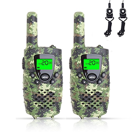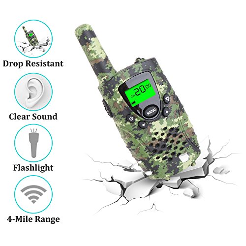 - [KID-FRIENDLY DESIGNS] - Portable and easy to use, 1.2m drop resistant, with cool camouflage exterior, compact bodies, ergonomic design, channel lock function and simple push-to-talk operation, intended for kids aged 3 and up, these camo walkie talkies would make an amazing gift for your little one.