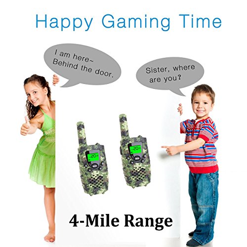 - [UP TO 4-MILE RANGE] - Up to 4 miles effective range in open field and 1/2 to 1 mile range in residential area, this walkie talkie set has got you covered anywhere from outdoor adventures like camping, road-trips, to running in the woods, in the neighborhood, and to indoor activities like shopping to the mall and pillow talks. Kids enjoy using small walkie talkies as part of their role play wherever they are!