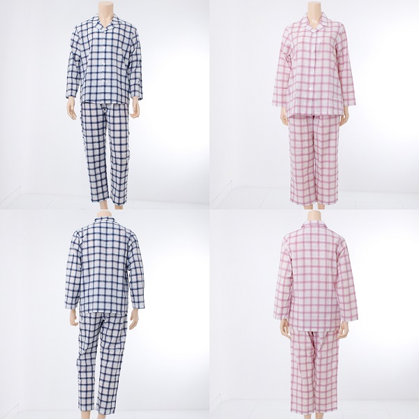 얇고 부드러운 촉감의 면 선염 체크 파자마. 간절기에 착용하기 편리하며