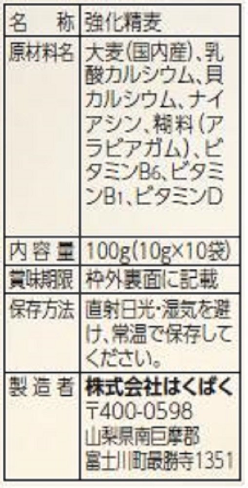 [Nutritional information table 1 pack: per 10 g] Energy 31 kcal, protein 0.6 g, lipid 0.1 g, carbohydrate 6.4 g, dietary fiber 0.8 g, sodium 2 mg, calcium 250 mg, vitamin B 1 0.3 mg, niacin 5 mg, vitamin B 6 0.6 mg