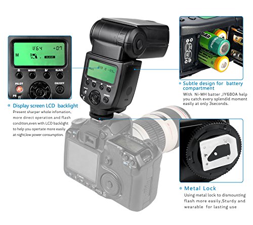 - Feature : This CPM580 is compatible with many camera with the standard hot shoe (such as Canon, Nikon, Pentax, Olympus etc.) / This flash has a guide number of 33 (ISO 100), a color temperature of 5500k, and 4 AA batteries (Alkaline or Ni-MH are usable) power the unit. / The CPM580 vertically rotates 0~90 degrees, and it horizontally rotates 0~270 degrees / One flash may last 1/1050s~1/2000s depending on the 1/8 - stop increment selected. One one set of batteries, expect 100-1500 flashes (AA alkaline batteries used) and a recycle time of approx. 0.3-5s (AA alkaline batteries used). / Power Management: Switch to the ON, the flash will start charging (the charging indicator is dim). After several seconds, the charging indicator turns red and JY680A is ready to shoot. For a test flash, press the test button. After use, press the ON/OFF to OFF to power off. If the red charging indicator lamp flickers in every 1s, it indicates low battery. In such case, the power will turn off automatically and you need to replace the batteries. Model Switch between: M and Milti; Power Control: . Press set Button, Then Press "up " and ''down'' to make power higher or lower and they are 1/128, 1/64, 1/32, 1/16, 1/8, 1/4, 1/2, 1/1. Protection Function: Protection in continuous flashes:To prevent the flash head from getting too hot and damage, please do not flash over 20 times when in power lever 1/2,1/1. Please cool down the flash unit for at least 10 minutes. The over-temperature protection function will be activated if you continue to flash after 20 times. In this state the charging time will turn to 10-25s. Please cool down the flash unit around 10 minutes and it will turn to normal state. Systematic over-temperature protection:When the inner circuit is over-heating, which indicates over use of the flash unit, the inner circuit will shut down power automatically. The flash unit will turn to normal state after the inner circuit is cooled down.