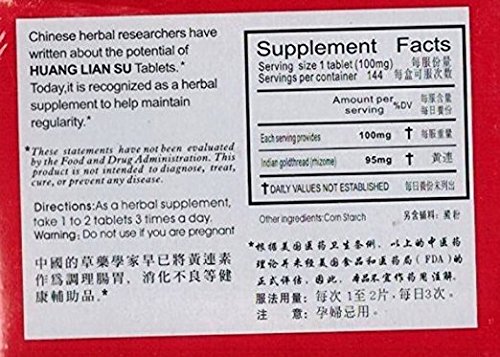 Huang Lian Su Tablets use a pharmaceutical extraction of Coptis Huang Lian, producing berberine hydrochloride. As a pharmaceutical extraction, it is significantly stronger and more concentrated than herbal Coptis Huang Lian. It is commonly prescribed in China for acute diarrhea and bacterial dysentery, and may be used for a variety of intestinal pathogens including the vacteria Proteus, Citrobacter, E.Coli, the fungus Candida Albicans, and intestinal protozoa including giardia. Coptis Huang Lian is effective for various strep and staph infections causing tooth abscess, canker sore, strep throat, sinus infection, and skin boil. 0