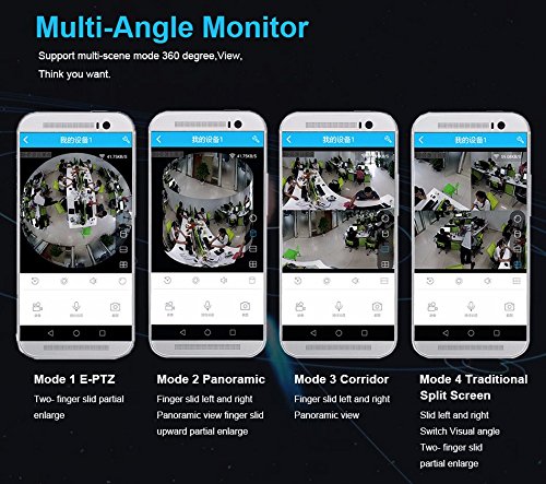 -. Feature : 3MP HD 1/3 Inch CMOS Fish Eye Sensor, Resolution: 1536 x 1536, Lens 1.19mm, Visual Angle 360 Degree Panorama, , IR Night Vision 6 to 10 meter, day and night automatic switching. / Multi Angle Monitor: Mode 1: Electronic PTZ, Mode 2:Panoramic, Mode 3: Corridor, Mode 4:Tranditional Split Screen / With TF card slot, max support 128GB Micro SD, Auto-cycled video recording; Built-in MIC and Speaker for two-way audio. / Support 2.4G WIFI (IEEE802.11b/g/n) and Wired Ethernet Cable connection, not support 5G WIFI; P2P Plug and play cloud, one key wifi configration / Users can access the camera remotely via WIFI or 4G of android or IOS Smartphone