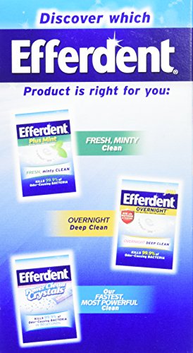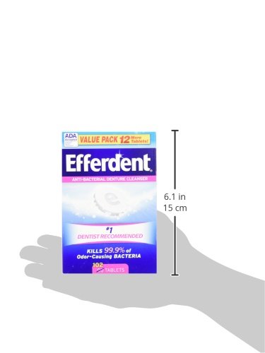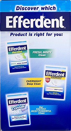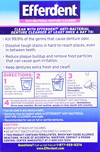 ReleaseDate : 2015-10-01 Studio : Medtech Product Inc. Publisher : Medtech Product Inc. Binding : Health and Beauty Product Description Nothing cleans full plate dentures, partials, retainers and other dental appliances like Efferdent Denture Cleanser because nothing has its powerful effervescent cleaning action. It's strong enough to take care of the toughest stains and forces its way into hard to reach places between teeth. Efferdent Denture Cleanser also fights plaque build-up and kills odor-causing bacteria. No wonder denture wearers feel confident when they use Efferdent Denture Cleanser. 0