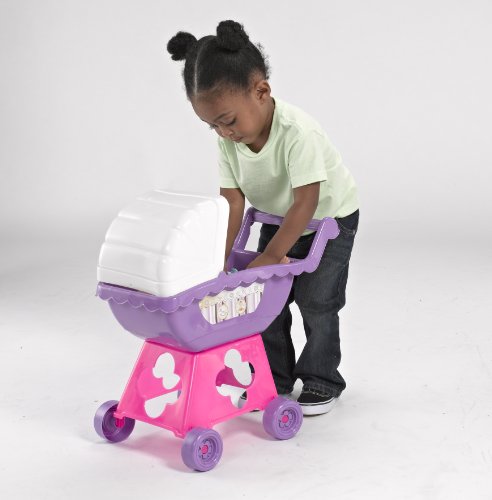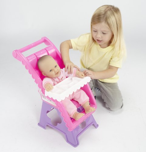 My Nursery 2 piece set. Includes moveable doll carriage and doll high chair. Moveable canopy on carriage, play food tray on high chair. High chair also includes restraining bar for dolls. Fits dolls up to 18" (doll not included). Durable washable plastic by amloid, a toy tradition since 1916. Easy 3 step snap assembly for carriage and high chair. Not intended for real infants.