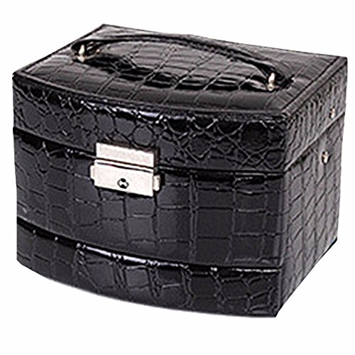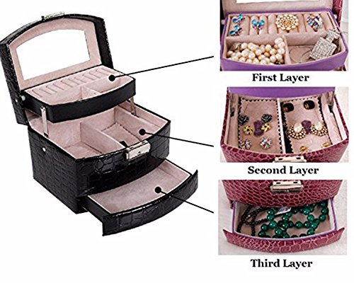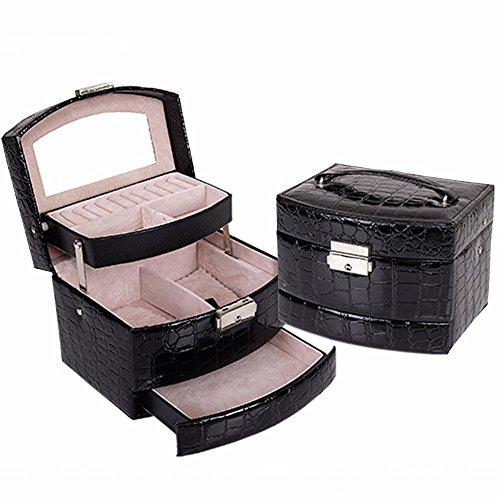 Soaptree Black Faux Leather Make Up Case 3 Layer Drawer Jewelry Box for Necklace Ring Earring Bracelet(B-3 Layers Jewelry Box)
