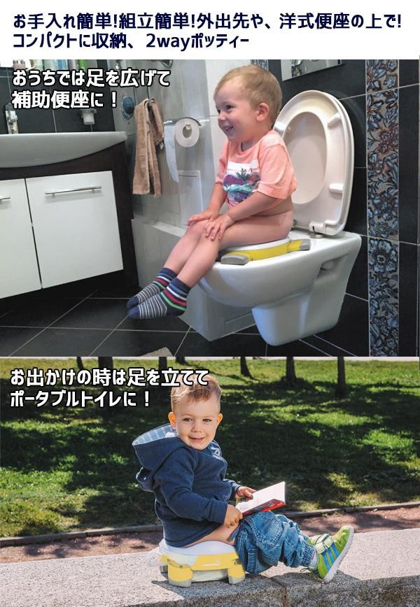 | 1台2役!!「補助便座」+「ポータブルトイレ」。おうちでは足を広げて補助便座に、お出かけの時は足を立ててポータブルトイレになる優れもの♪ |