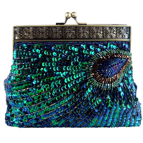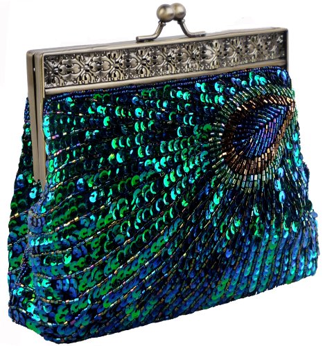 Glam up any party dress with this elegant sunburst shimmer clutch features stunning blue sequins, golden and bronze beads in antique clasp closure frame. These handmade beading are perfectly designed along with the sunburst formed by turquoise, bronze, brown, purple and blue beads. The antique kiss clasp closure secures your belongings while an interior open pocket holds your smaller item or lipstick whenever you need. This evening handbag purse is made of sheer satin. The glamorous design even carries on the back side of this handbag. Two hidden / detachable chains to achieve a 6.5 inch or 21 inch drop. Purse pairs up perfectly with cocktail party or any special occasion ensemble.**Official MG Collection® product by MyGift® includes satin dust bag and protective gift box. Products sold by other sellers may vary.**