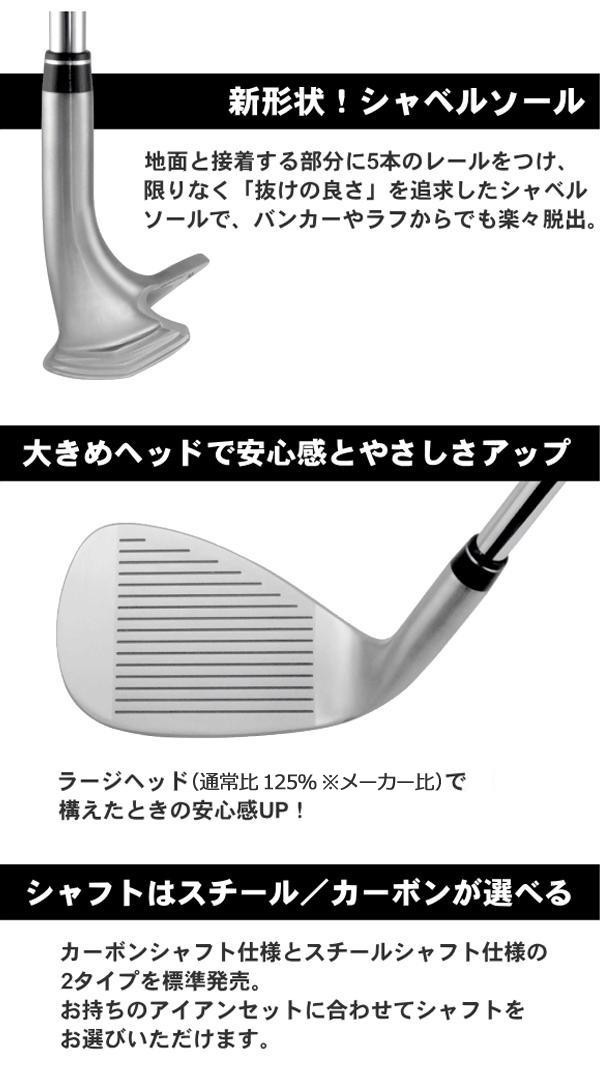 | 地面と接着する部分に5本のレールをつけ、限りなく「抜けの良さ」を追求したシャベル形状のソールで、バンカーやラフから楽に脱出ができます。また通常比125%の大型ヘッドによりミスヒットを削減。バンカーだけでなくあらゆる場面でのアプローチの武器になります!! |