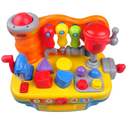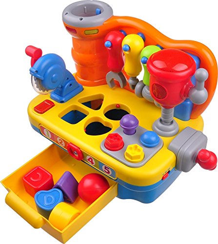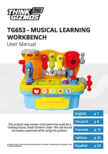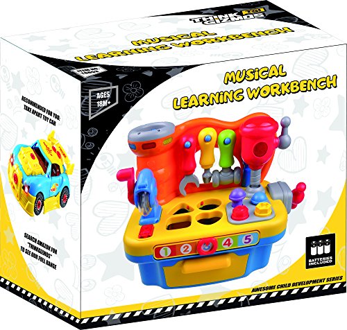 The Interactive Builders Workbench toy from Think Gizmos Awesome Child Development Series will provide hours of fun with the large amount of different activities built in. The little builder in your house can learn letters, shapes, number, colours and different actions all whist playing with their new favourite toy. Activities include a shape sorting game with lights and sounds and a number slider which speaks the numbers and plays different songs. Included with the Builders Workbench are 3 built in tools, a Circular Saw, Drill and Clamp which all make light up and make noises when used. As well as these there are 3 detachable tools, a hammer, screwdriver and wrench which can be used on the screws and nails built into the workbench. The children's workbench also has a built-in volume control for when a bit of quite time is needed. All that is required are 2x AA batteries. The TG653 Musical Learning Workbench is recommended for children aged 18 Months + and is a 'ThinkGizmos' branded product.Feature