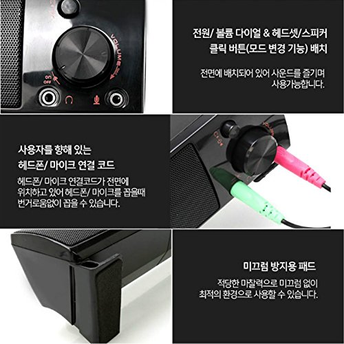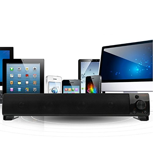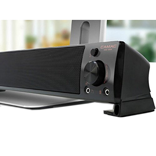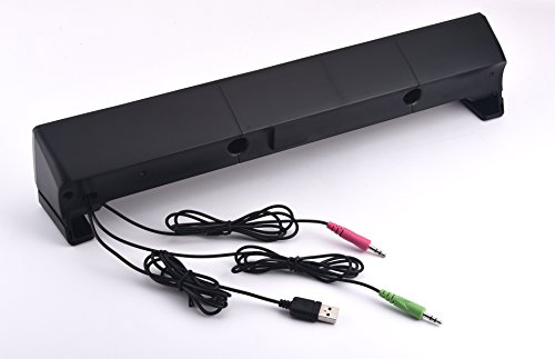 -. Feature : Soundbar can give you the sound you want without big speakers and long cables. Compatible with most of computers laptop,PCs,cellphones / With volume control button,Build in 4 Speakers. 2 Speakers in the the left and the right with high pitch,the 2 Sperkers in the middle with bass to aford Stereo Sound.Magnetic Shielding safeguards computer monitor. / music comes through crisp and clear. Games and movies are a whole new experience / it has a 3.5mm microphone jack, insert into the PC Laptop Micphone hole to enlarge the micphone sound for Chat on line,also has a 3.5mm Headphone Jack can insert into iPhone Samsung LG Sony Smart Cellphone to Get Enlarge Sound / No extra software. enjoy the rich stereo sound. Works with Windows 7 8 XP and Mac OS,This soundbar have a 3.5mm Micphone and a Headphone hole to use
