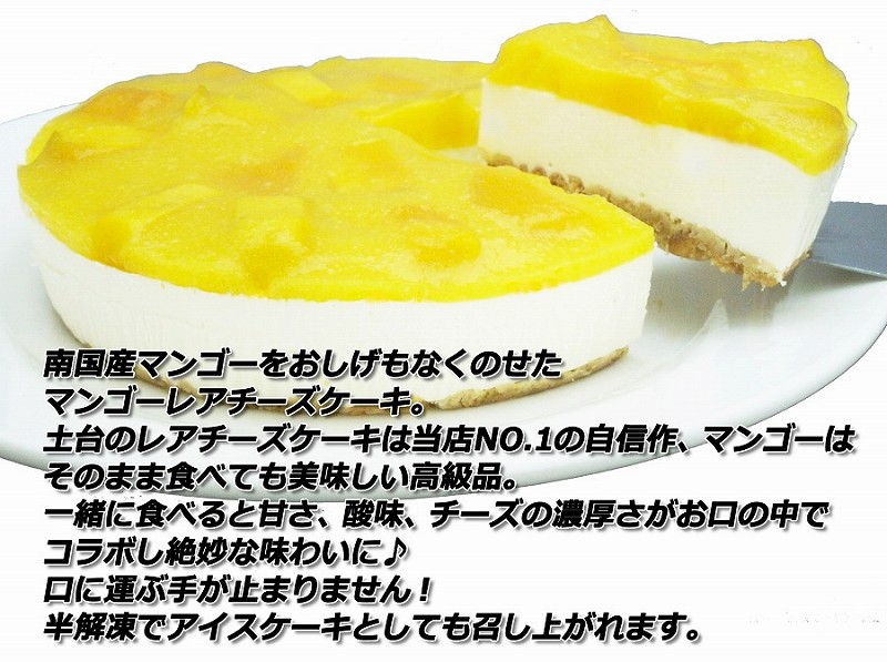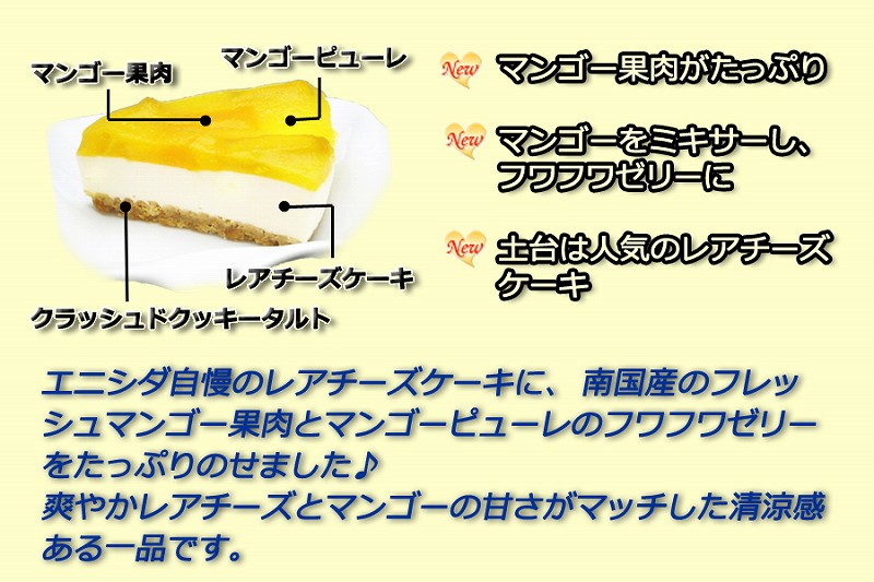 お取り寄せ・プレゼント・ギフトにもどうぞ♪エニシダ自慢の濃厚レアチーズケーキに、南国産のフレッシュ高級マンゴー果肉とマンゴーピューレのフワフワゼリーをたっぷり豪華にのせました♪爽やかレアチーズとマンゴーの甘さがマッチした清涼感ある一品です。【半解凍でアイスケーキとしても召し上がれます】●熨斗/のし対応しています表書き、名入れを希望の方はご指定ください。【サイズ】5号 15cmホール 480g【原材料】クリームチーズ・生クリーム・砂糖・レモン汁・ゼラチン・バター・クッキー・マンゴー・マンゴーピューレ【賞味期限】冷凍:発送日から1ヶ月(解凍後2日:解凍は冷蔵庫で4~8時間程度、解凍時に若干ボトム部が湿っぽくなりますが味に支障はありません。)