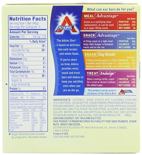-. Feature : Atkins Endulge Bars, Chocolate Coconut, 5-Count 1.4-Ounce Bars (Pack of 6) / Only One Gram of Sugar / No Trans Fats / Low Glycemic Impact