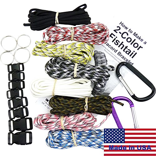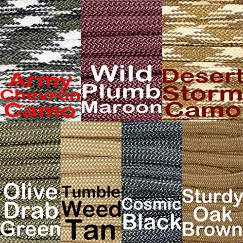 ✓ The "STARTER KIT for GUYS KIT" includes 7 complimentary colors of Paracord: Army Chevron Camo, Olive Drab Green, Wild Plumb Maroon, Desert Storm Camo, Tumbleweed Tan, Cosmic Black, and Sturdy Oak Brown. This Paracord is 7-strand, Type III, 1,000 Denier Polyester, 550 pound break tested, Parachute Cord, 1/8 inch in diameter, manufactured in the United States.