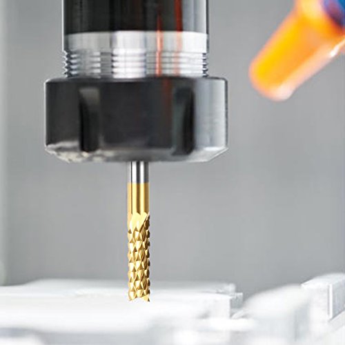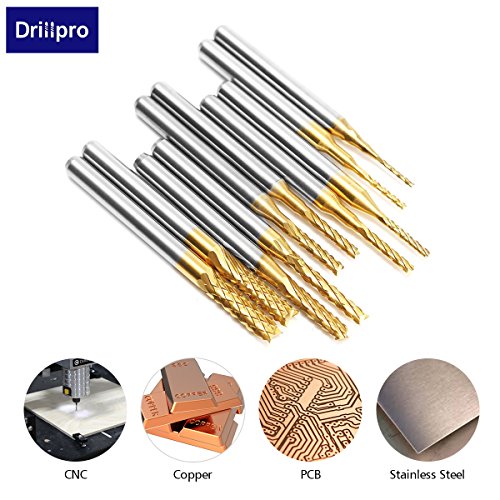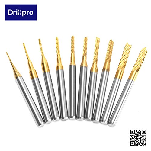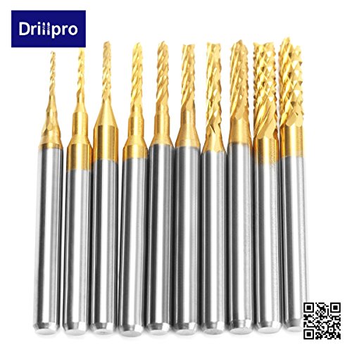 DRILLPRO 10Pcs 0.8 - 3 mm Titanium Coat Carbide End Mill Engraving Bits CNC Rotary Burrs Set Tool PCB Mould Plastic Fiber Carbon Fiber Hardwood, 1/8'' Shank
