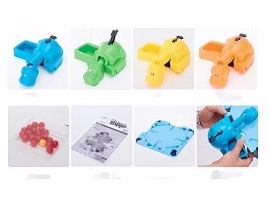 Game base comes with 4 hippo heads, 4 hippo bodies, 4 marble launchers and guides, 20 plastic marbles, label sheet and instructions