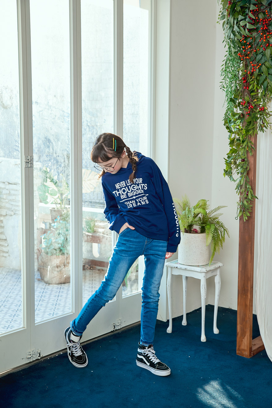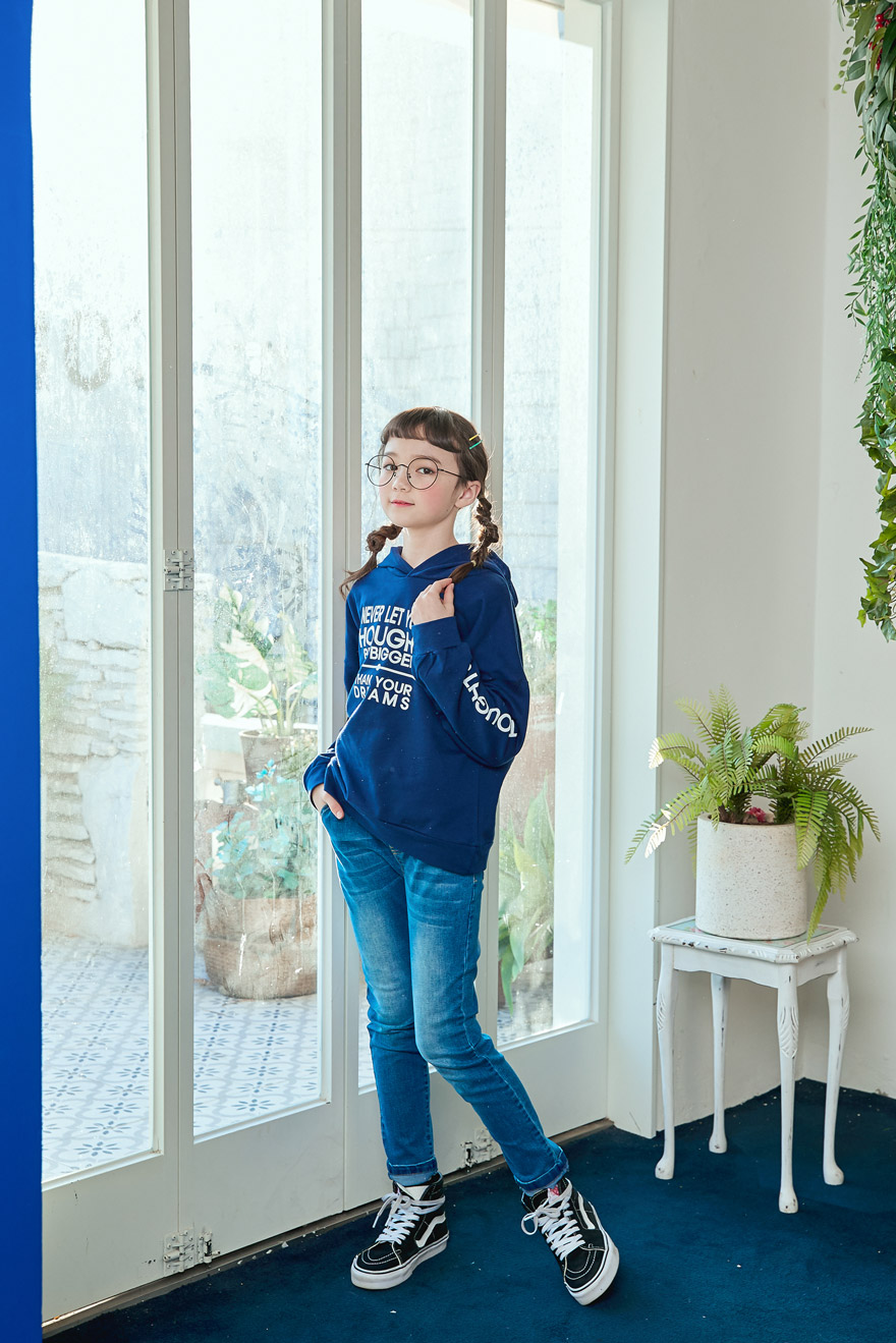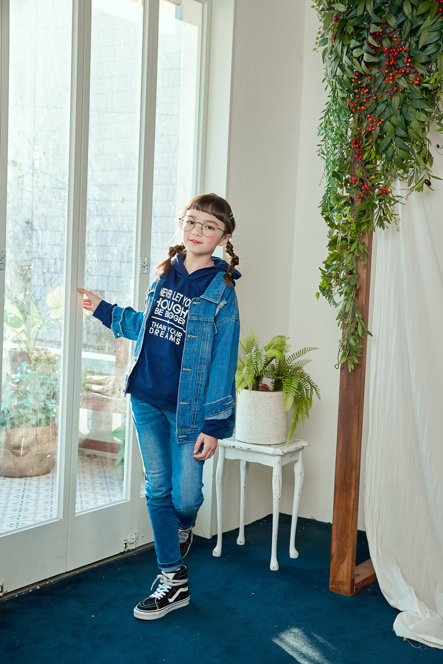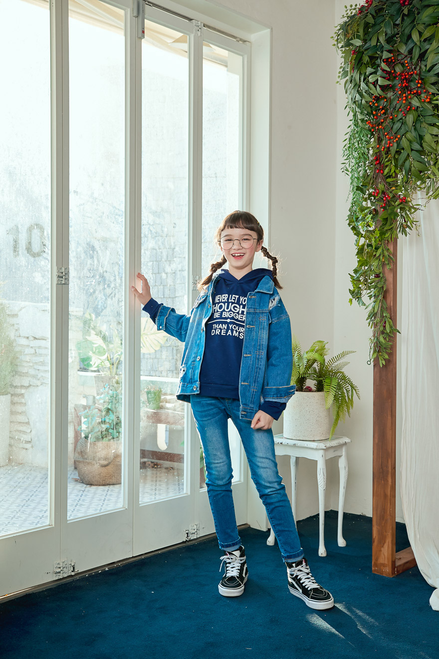 9, 11, 13, 15, 17호로 준비되어 있으며 하단에 측정된 사이즈 표를 참고해 주세요. 이 제품은 표준 사이즈로 디자인 된 제품입니다. 피팅한 여아의 모델은 143cm에 31kg으로 다소 마른체격이며, 여유있게 진청 13호를 착용하였습니다. 피팅한 남아의 모델은 151cm에 34kg으로 다소 마른체격이며, 여유있게 진청 15호를 착용하였습니다. 깔끔한 핏으로 잘 맞네요 ;)