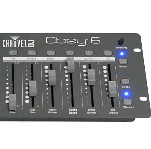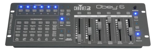 Studio : Chauvet DJ Publisher : Chauvet DJ Binding : Electronics Product Description Universal compact DMX-512 controller ideal for LED fixtures ? Controls up to 6 fixtures individually with up to 6 channels per fixture ? Pre-set color buttons let you quickly and effortlessly select colors on the fly ? Quick Color buttons allow you to easily add layered effects ? Increase effects by simultaneously operating each fixture in different playback modes with variable fade times ? Increase flexibility with playback options that include manual RGBAW UV, automated and sound-activated mode; playback options include - Preset: 24 built-in colors - Chases: 18 manually triggered automated programs - Color macro: manually scroll through the color spectrum - Color fade: automatically scroll through the color spectrum - Color fade delay: automatically scroll through the color spectrum with a small delay to each fixture - Auto: randomly selects different colors for each fixture ? Increase control with adjustable audio sensitivity, strobe, and blackout effects ? Fits best in the CHS-25 VIP Gear Bag Specifications: ? DMX Channels: 36 ? DMX Connectors: 3-pin XLR ? Input Voltage: 9 VDC, (external power supply: 100 to 240 VAC, 50/60 Hz) ? Weight: 3.8 lb (1.8 kg) ? Dimensions: 15.5 x 5.5 x 1.9 in (393 x 140 x 47 mm) ? Approvals: CE 0