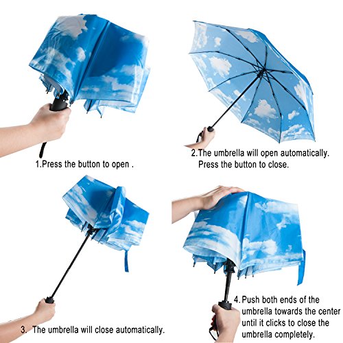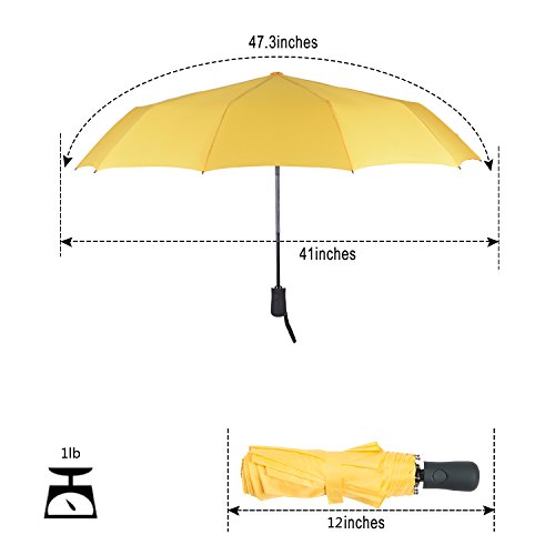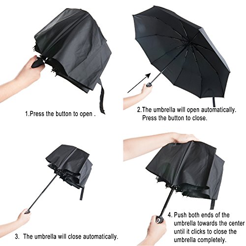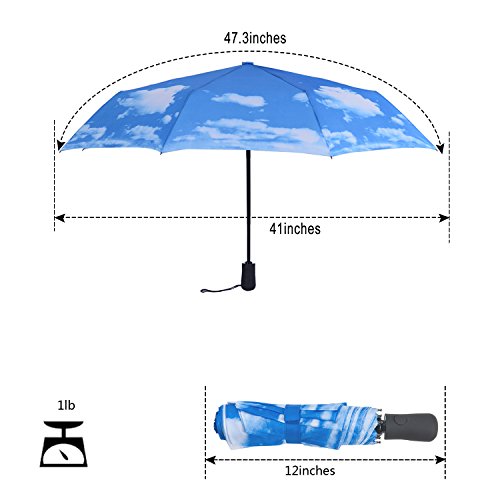 -. Feature : UMBRELLA SIZE: OPEN SIZE: 47.3*41*25 inches; Close size: 12in(Length) / AUTOMATIC: Auto open/close function allows for easy one-handed operation. / 8/9/10-RIB CONSTRUCTION: fortified with 8/9/10 resin-reinforced fiberglass ribs that flex slightly to withstand powerful gusts without turning inside out. / COMPACT: 12in long and weighs less than 1lb for easy storage in purses, briefcases, backpacks, luggage and more. / WORKMANSHIP: The ergonomic, slip-proof, and rubberized handle with wrist strap allow for easy carrying. A protective travel sleeve is included.