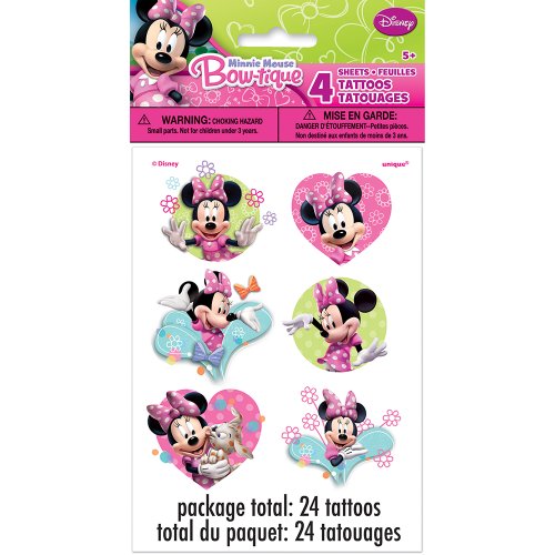 -. Binding : Kitchen -. Brand : Unique -. Color : multi-colored -. EAN : 0011179253777 -. Feature : 4 Minnie Mouse Tattoo Sheets / Package includes 24 total tattoos on 5.5" x 4" sheets / These tattoos can be applied easily with a cloth and water and can be removed with soap and water / Use these tattoos as party favors or a fun party activity / Coordinate with other Minnie Mouse party supplies and decorations from Unique -. IsAdultProduct : 0 -. Label : Unique Party Favors -. Manufacturer : Unique Party Favors -. Model : 25377 -. MPN : BB25377 -. PackageQuantity : 1 -. PartNumber : BB25377 -. ProductGroup : Kitchen -. ProductTypeName : KITCHEN -. Publisher : Unique Party Favors -. Size : One Size -. Studio : Unique Party Favors -. Title : Minnie Mouse Tattoos, 24ct -. UPC : 011179253777 -. Warranty : No Warranty