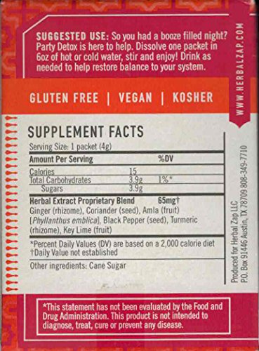 -. Binding : Health and Beauty -. Brand : Herbal Zap -. EAN : 0852486005181 -. Feature : Herbal ZAP Digestive Support is an instantly dissolving Ayurvedic herbal supplement beverage. / Works to help restore balance from after party effects. / Herbs Ginger, Coriander and Amla help to soothe and calm the digestive system / Turmeric (activated by black pepper), Ginger, Amla all help to support your body's detoxing power. / Supports the Liver in antioxidant activities. -. IsAdultProduct : 0 -. Label : Herbal Zap -. Manufacturer : Herbal Zap -. MPN : 758026 -. PackageQuantity : 25 -. PartNumber : 758026 -. ProductGroup : Health and Beauty -. ProductTypeName : HEALTH_PERSONAL_CARE -. Publisher : Herbal Zap -. Studio : Herbal Zap -. Title : Herbal Zap Party Detox Ayurvedic Herbal Supplement 1 box of 25 packets -. UPC : 852486005181