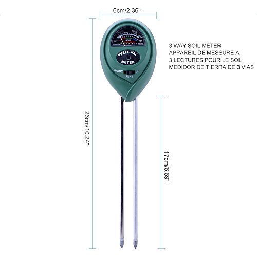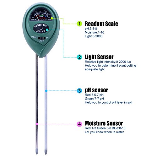 -. Feature : 🌺🌺Soil Moisture Meter, let you know when to water, help the plants grow healthy and strong; / 🌷🌷Light and PH acidity Tester, let you know how to control the PH level, make the plant have adequate light; / 🌻🌻No batteries or electricity needed, just need push the soil meter into the soil, then can read moisture levels; / 🌼🌼Colorful coded reading system, from red, green to blue, easy to see and read; / 🌸🌸Compact and portable design, convenient for indoor or outdoor use.