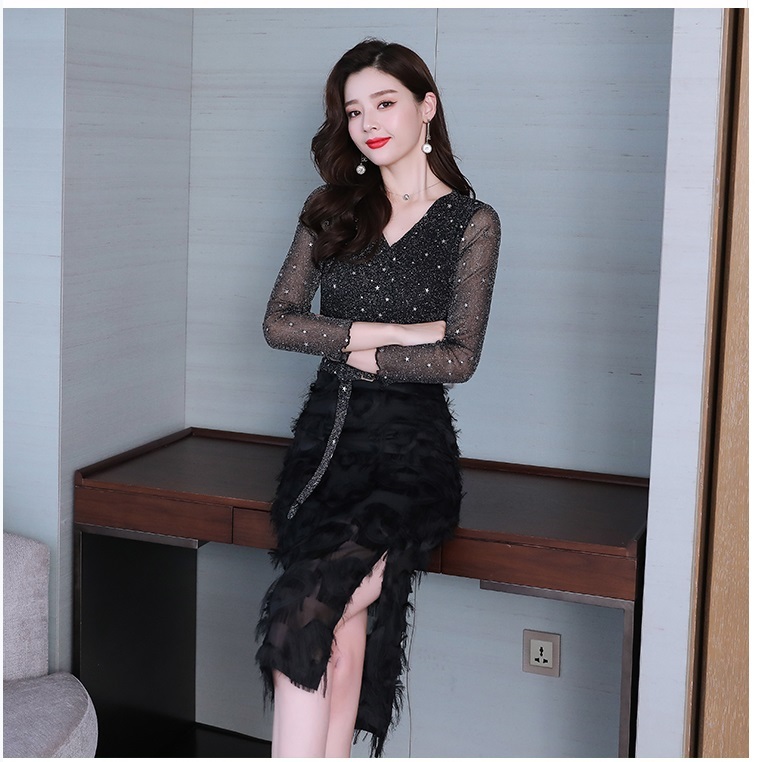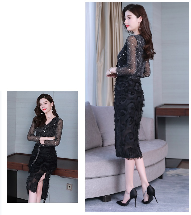 Vネック 星柄レーストップス スリット入り タイトスカート ベルト付き 二点セット