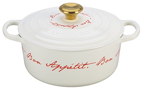 -. Feature : Bon Appetite Script - Limited Edition / Gold knob is safe at any oven temperature / Even heat distribution and superior heat retention / Durable, nonreactive sand-colored interior enamel / Colorful, long-lasting exterior enamel that resists chipping and cracking