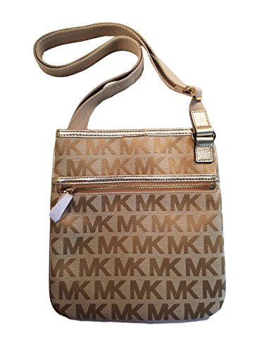 Wrapped in jacquard fabric that is printed with MK's block lettering on both the front and the back. It's trimmed in luggage leather along with gold tone hardware. This large cross-body is lined in tan MK logo fabric and features an inner zippered pocket and an open slip pocket. It has a magnetic top closure. There's an exterior zippered pocket on the front, on top of an open slip pocket with a magnetic closure. There's also an open slip pocket on the back. There's a single beige canvas web adjustable shoulder / cross-body strap. It measures approximately 9" (L) x 10" (H) x 1" (W).Feature