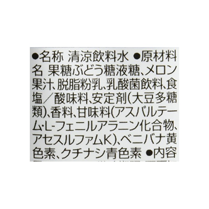 원재료:과당 포도당액당,멜론 과즙,탈지분유,유산균 음료,식염,신맛료,안정 제(대두다 당류)고, 향료,감미료(아스 PAL《데무》L-회《니루아라닌》화합물,assessment《루후무》K)고, 잇꽃(붉은 꽃) 황색소,치자나무 청색소