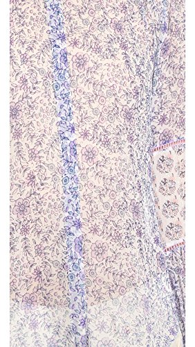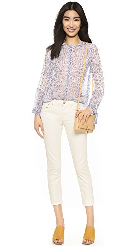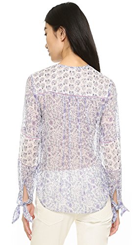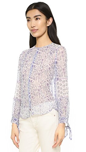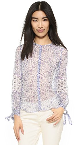 A lightly textured Rebecca Taylor blouse in a pretty floral print. Lamé pinstripes accent the yoke and elbows, adding a hint of playful shimmer. Curved, uneven hem. Long sleeves with bow-trimmed cuffs. Sheer.Feature