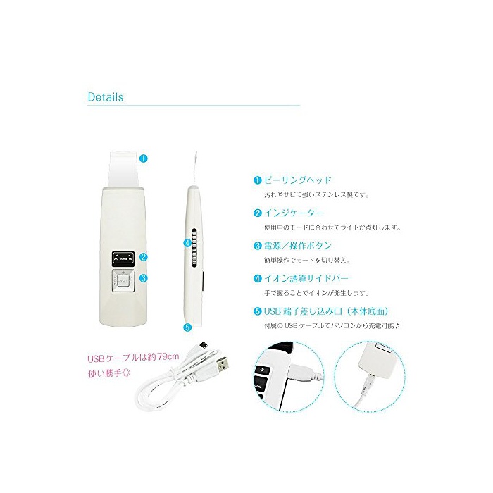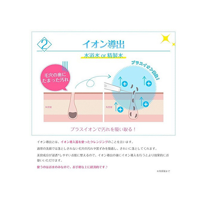 【이온도 나오고 얼룩을 흡수한다!】이온도출이란,이온 도입을 사용한 클린싱 입니다.통상의 세안으로는 떨어뜨릴 수 없는 모공의 얼룩이나 검은 얼룩을 흡착하고, 예쁘게 떨어뜨려 줍니다.미용 성분이 침투※하기 쉽 피부에 조절하는 때문에,이온도출의 다음에 이온 도입을 하면 보다 효과적.사용하는 것은 물 만이기 때문에,간단인 위에 경제적입니다♪