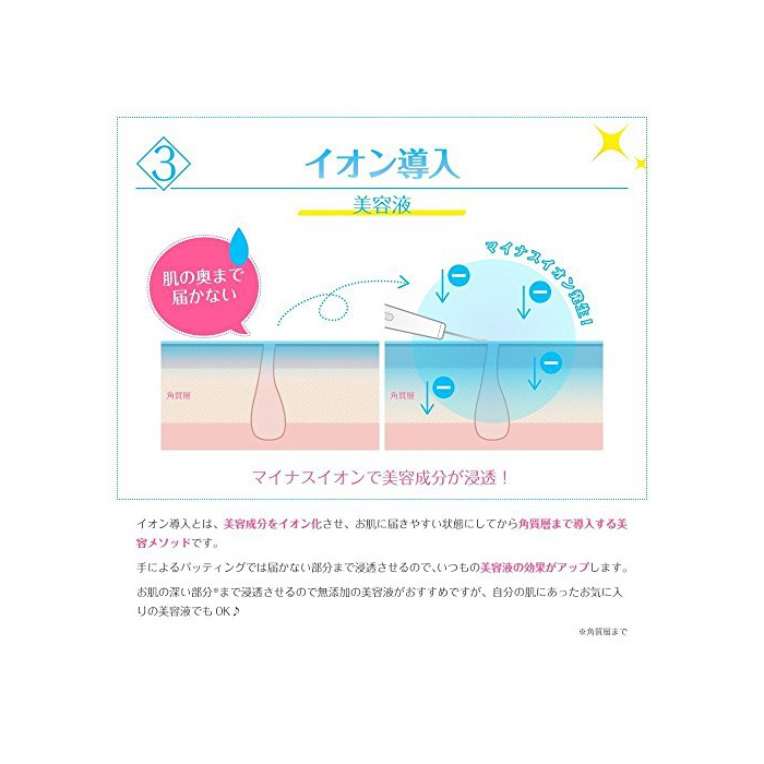 【이온 도입으로 미용 성분이 침투!】이온 도입이란,미용 성분을 이온화 하게 하고, 피부에 닿기 쉬운 상태로 하고 나서 각질층까지 도입하는 미용 mezzo《도》입니다.손에 의한 파《딘구》에서는 닿지 않은 부분까지 침투 시키는 때문에,여느 미용 효과가 업 합니다.