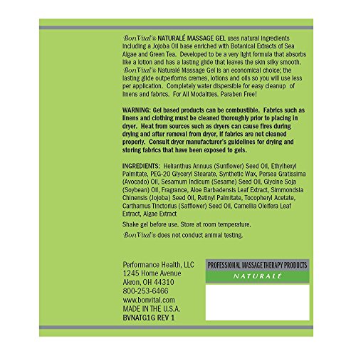 Studio : TheraBand Publisher : TheraBand Binding : Misc. Product Description Bon Vital´ Naturale Massage Gel - uses all natural ingredients including a Jojoba Oil base enriched with Botanical Extracts of Sea Algae and Green Tea. Developed to be a very light formula that absorbs like a lotion and has a lasting glide that leaves the skin silky smooth. Bon Vital´ Naturale Massage Gel is an economical choice; the lasting glide outperforms cremes, lotions and oils so you will use less per application. Completely water dispersible for easy cleanup of linens and fabrics. For All Modalities. 0