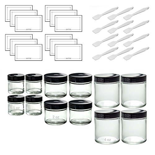 Clear Glass Straight Sided Jars (12 Pack) Includes 4 - 1 oz, 4 - 2 oz, 4 - 4 oz Clear Glass Jars + Spatulas and Labels