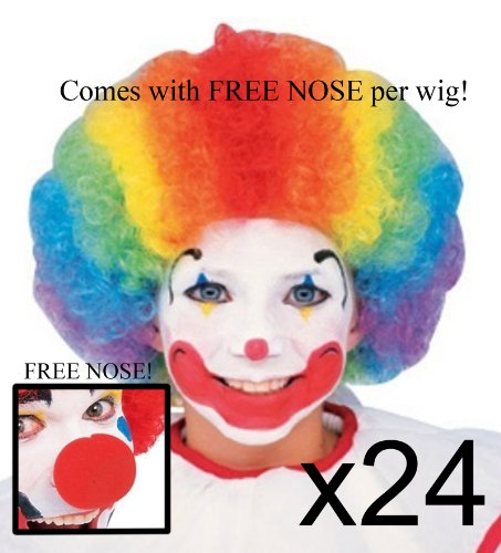 -. Color : Rainbow -. Feature : Wholesale - LOT OF 24 - CLOWN Wigs -WITH FREE CLOWN NOSES / WIG COLOR: Rainbow NOSE COLOR: Red SIZES: One Size Fits Most / These colorful afros are perfect for birthday parties or as the perfect topper for any clown costume! / Great costume accessory when you want to add some fun to your getup. / Condition: New and in poly bag with printed header. Buyer will get 24 each -. ProductGroup : Single Detail Page Misc -. ProductTypeName : MISC_OTHER -. Title : (LOT OF 24) Clown Wig Circus Fro WHOLESALE Birthday Costume Rainbow Hair With a FREE FOAM NOSE per wig