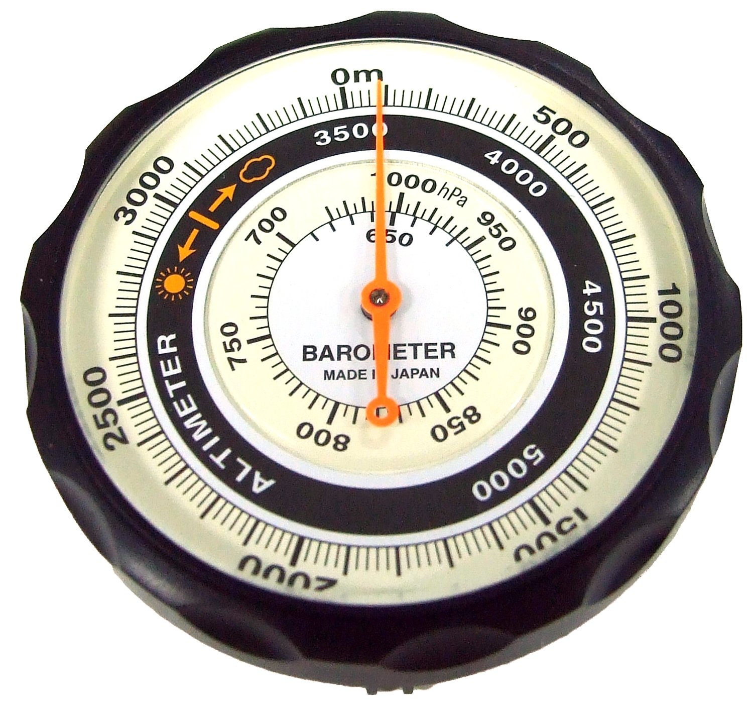 Barometric altimeter of analog display which measures atmospheric pressure and converts to high altitude.